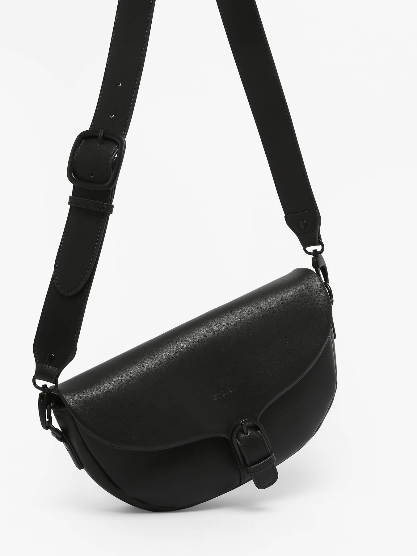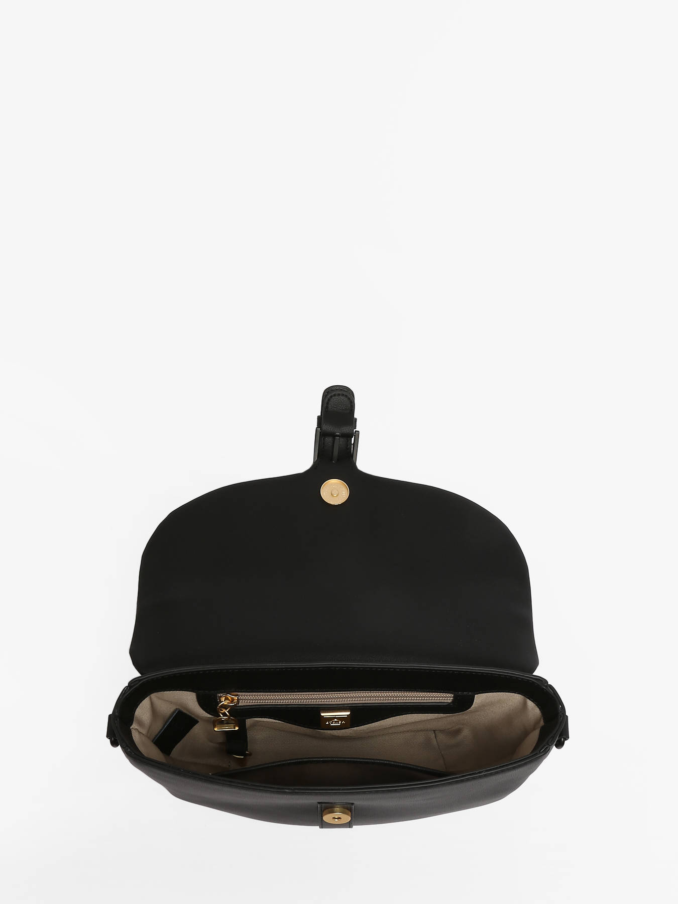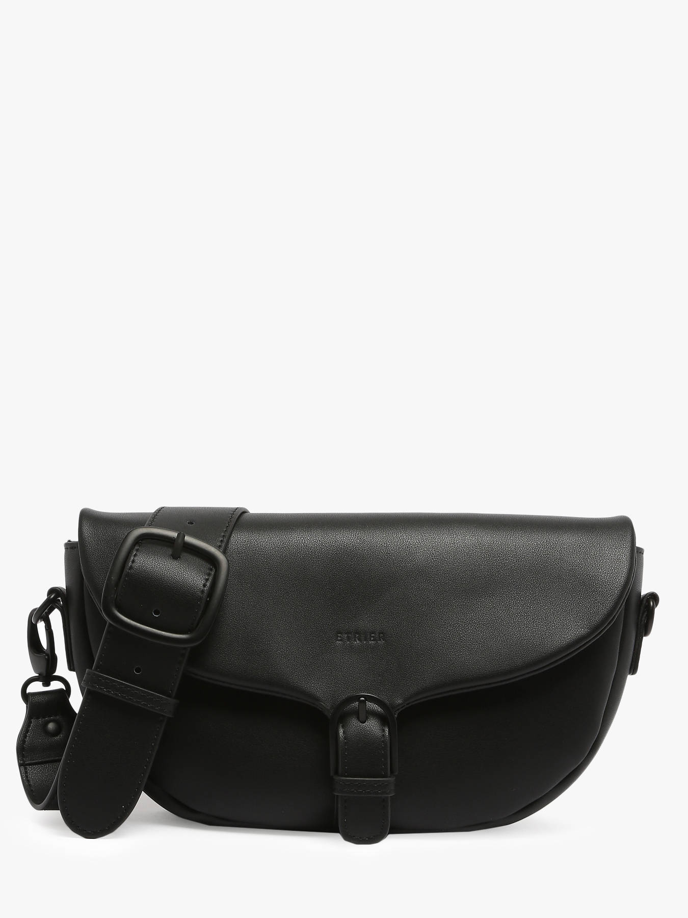 The new version of the ETRIER shoulder bag from the OXER line, in a half-moon shape, is adorned with tone-on-tone accessories. Crafted from cowhide leather, it features a back pocket and closes with a flap and magnetic snap. The adjustable and removable leather shoulder strap offers a short cross-body carrying option. The spacious interior includes a compartment with a patch pocket and a zip pocket for optimal organization.