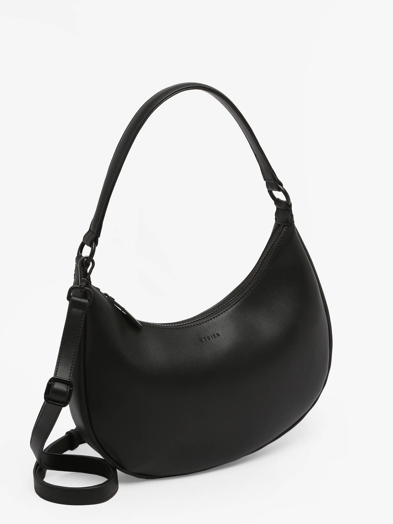 The ETRIER shoulder bag from the OXER line, in a half-moon shape, opts for suede leather, thus adding roundness and softness to its design. Made of cowhide leather, it features a back pocket and closes with a zipper. Its leather handle and adjustable, detachable shoulder strap offer versatile carrying options: over the shoulder or across the body. The spacious interior includes a compartment with two patch pockets and a zip pocket for optimal organization.