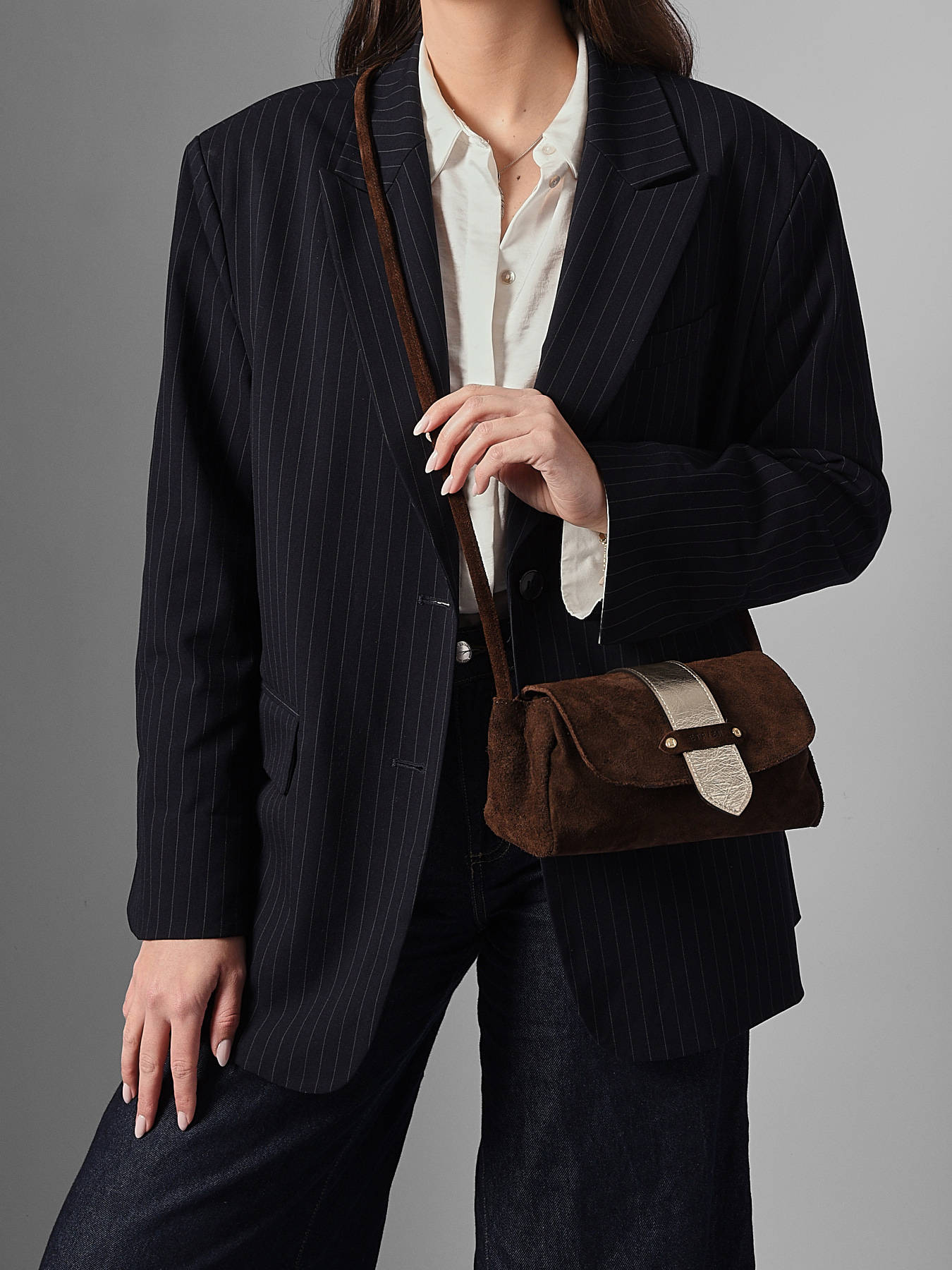 The AGNES crossbody bag by ETRIER is crafted from Italian suede leather, offering a soft and refined texture. This model is shown here in size S and features a flap closure secured with a magnetic snap button. It is also available in size M for those who prefer a roomier option.